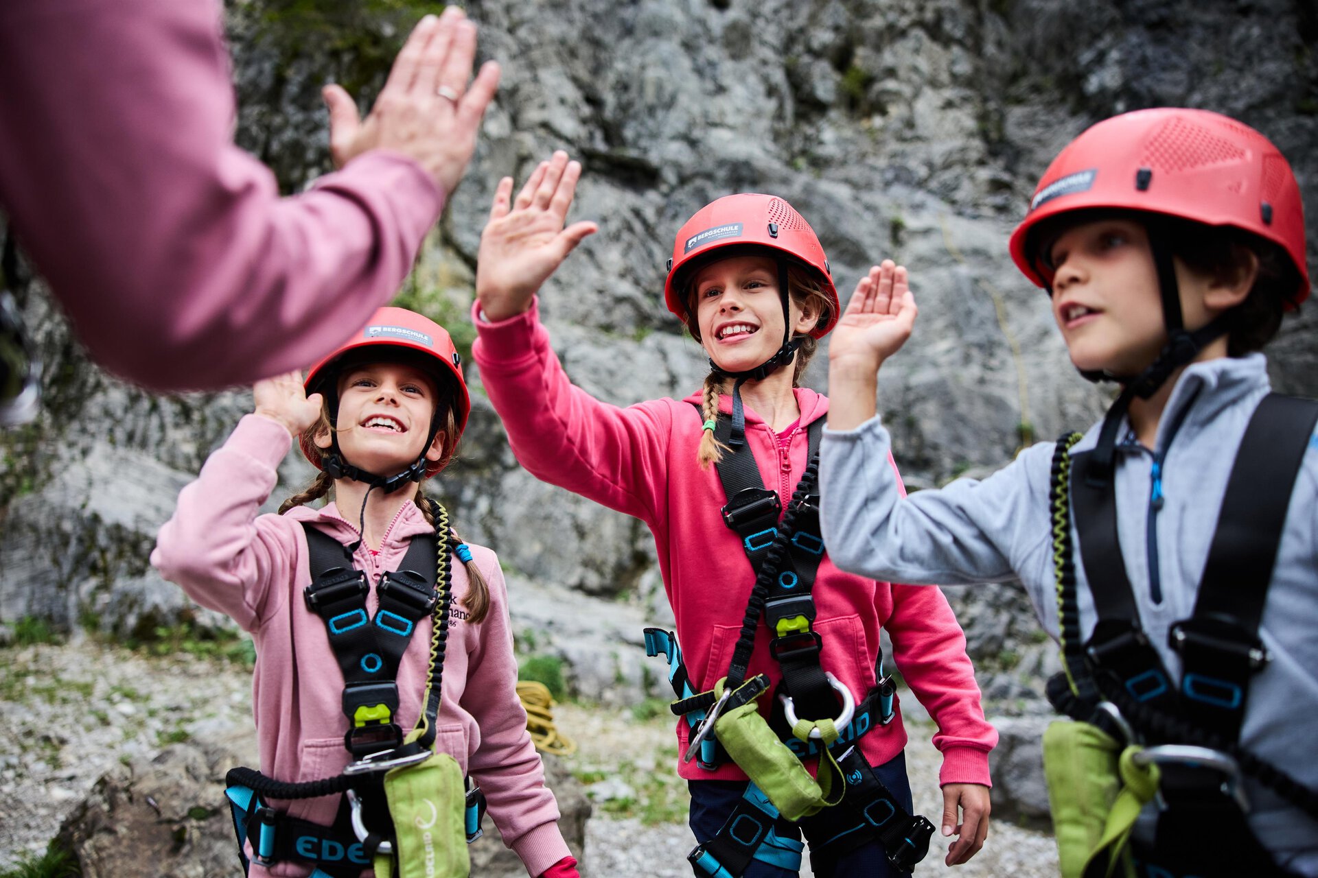 Drei Kinder in Kletterausrüstung begrüßen einen Erwachsenen. Sie tragen Helme und lächeln vor einer felsigen Kulisse. | © Kleinwalsertal Tourismus | Oliver Farys