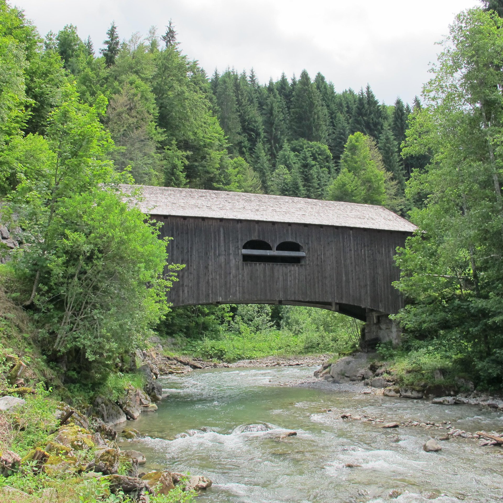 Dieses überdachte Brückenbauwerk findest du auf dem Wanderweg (Breitachweg) von Hirschegg nach Riezlern.