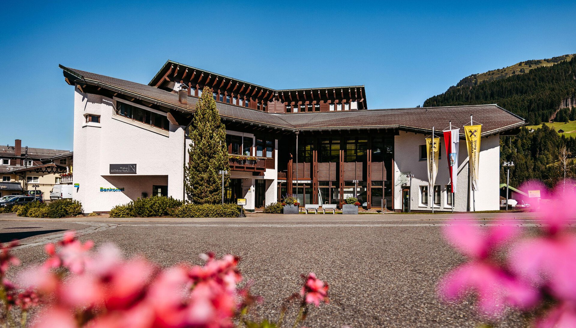 Ein modernes Gebäude mit einer eleganten Fassade und umgeben von schönen Blumen. Im Hintergrund sind Berge und ein klarer Himmel sichtbar. | © Walser Raiffeisen Bank AG