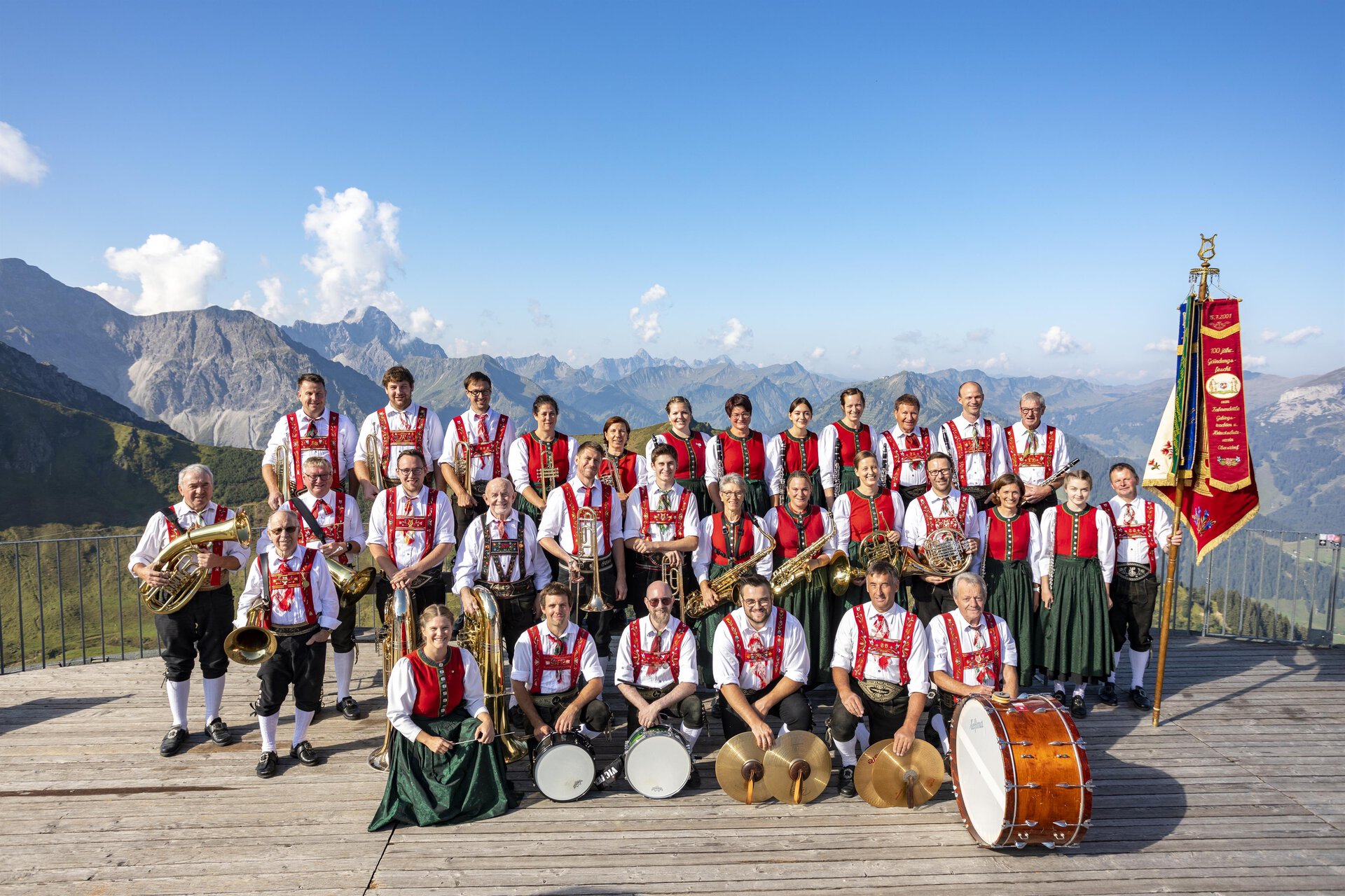 A large music band in traditional costumes stands on a wooden platform with a mountain view. Beautiful alpine landscapes are visible in the background. | © Trachtenkapelle Riezlern