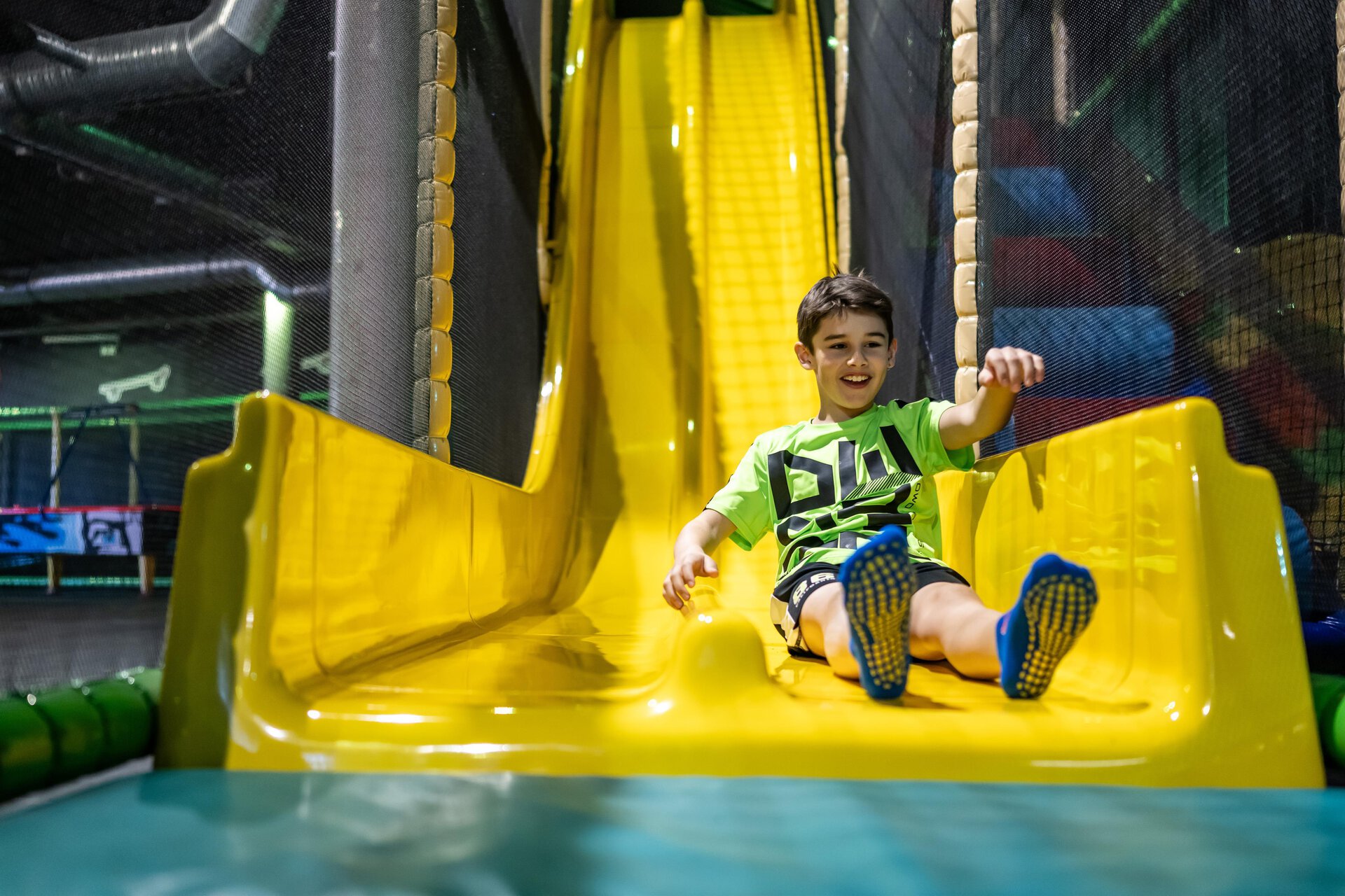 A cheerful boy slides down a yellow slide in a playground. The space is designed to be colorful and inviting. | © Wonnemar Sonthofen | interSPA Gruppe