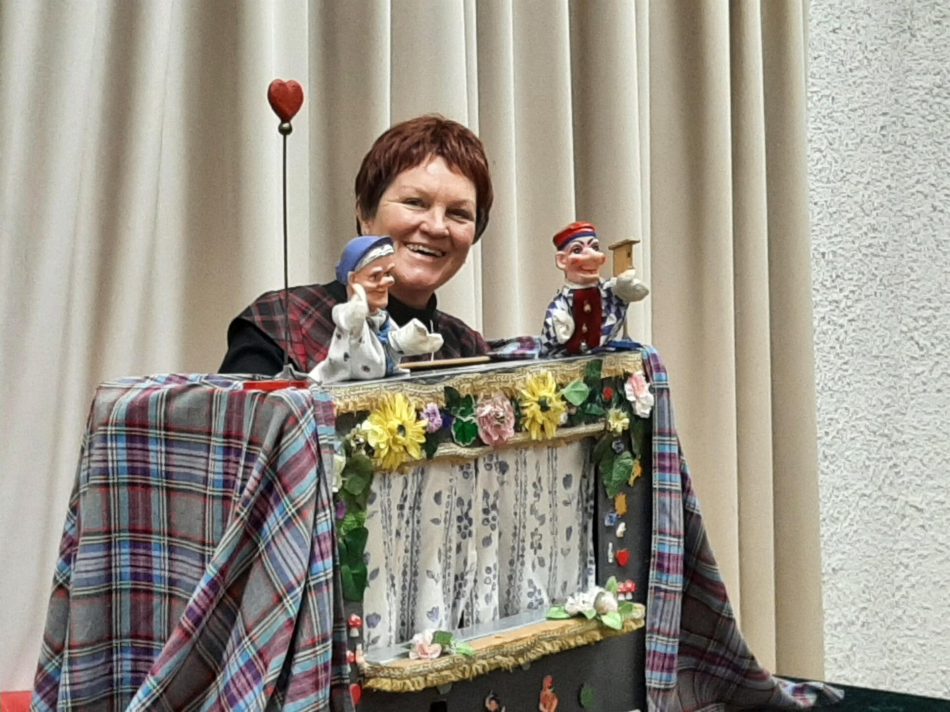 A woman presents a puppet show with two handcrafted puppets. The background is adorned with a bright curtain and colorful decorations. | © Marie Luise Kaiser | Veronika Senn