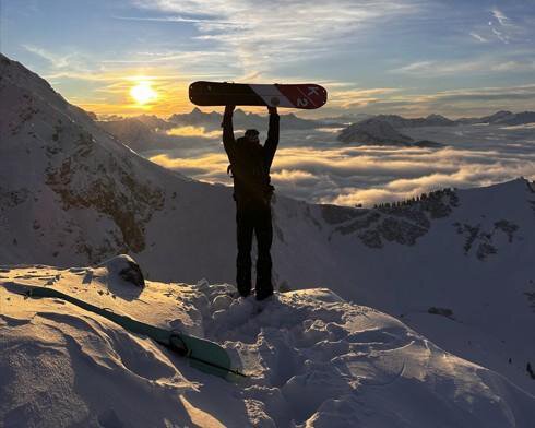 A snow sports enthusiast stands on a snowy peak, holding a snowboard up high. In the background, the sun shines between the mountains and a blanket of clouds glows in golden colors. | © Abenteuer Vertical | Christian Kohler