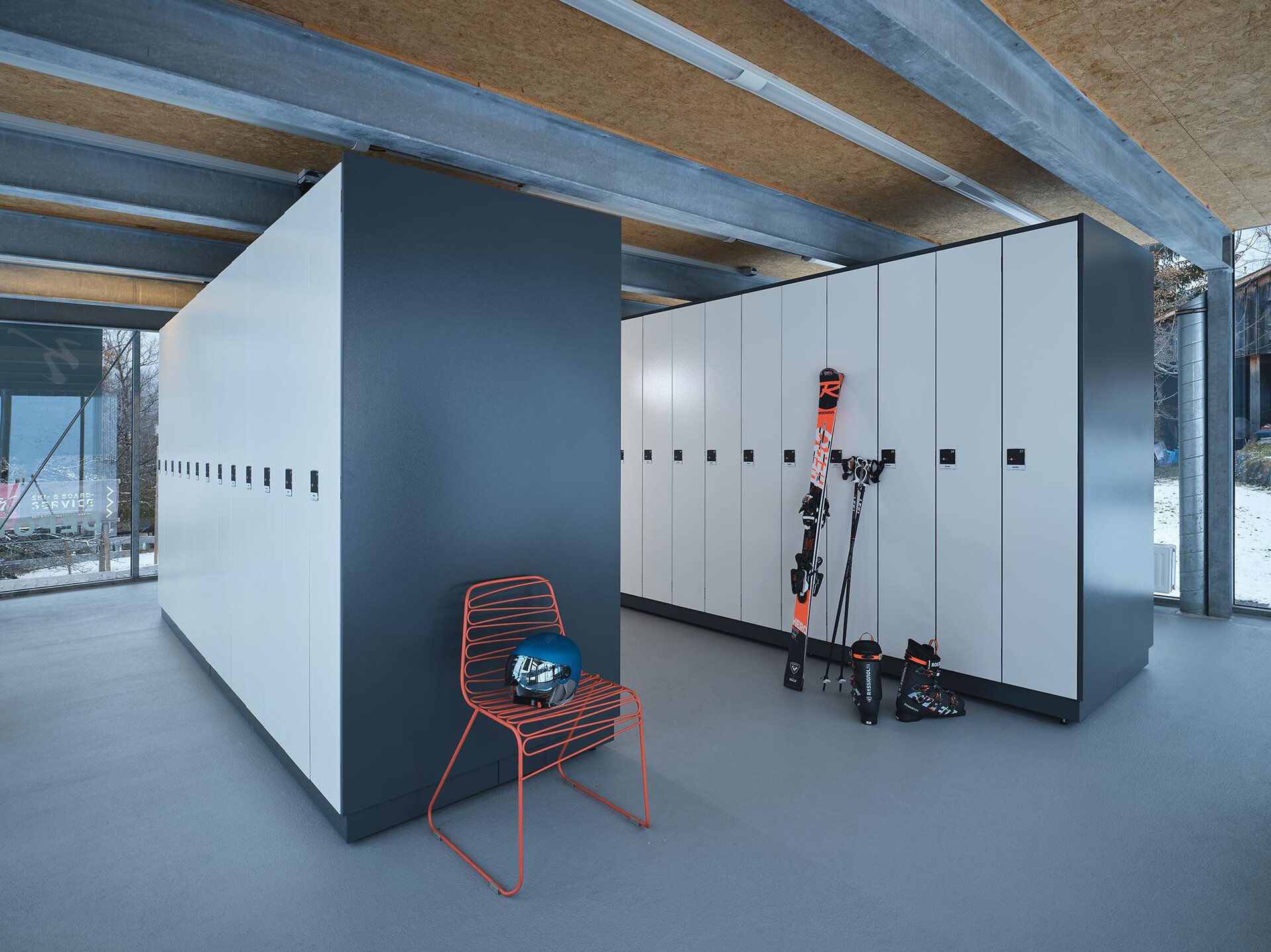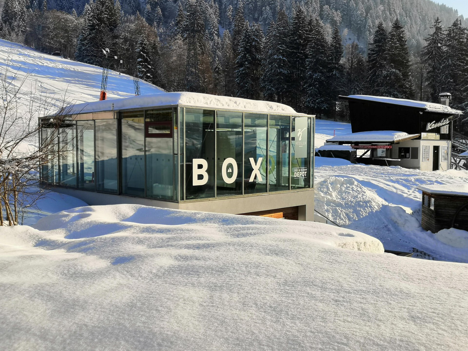 Depot for skis, snowboard and shoes. "Kessler Lift / Kanzelwandbahn" - in the striking glass box. The heated self-service boxes provide space for 2 pairs of skis / boards and 2 pairs of shoes.