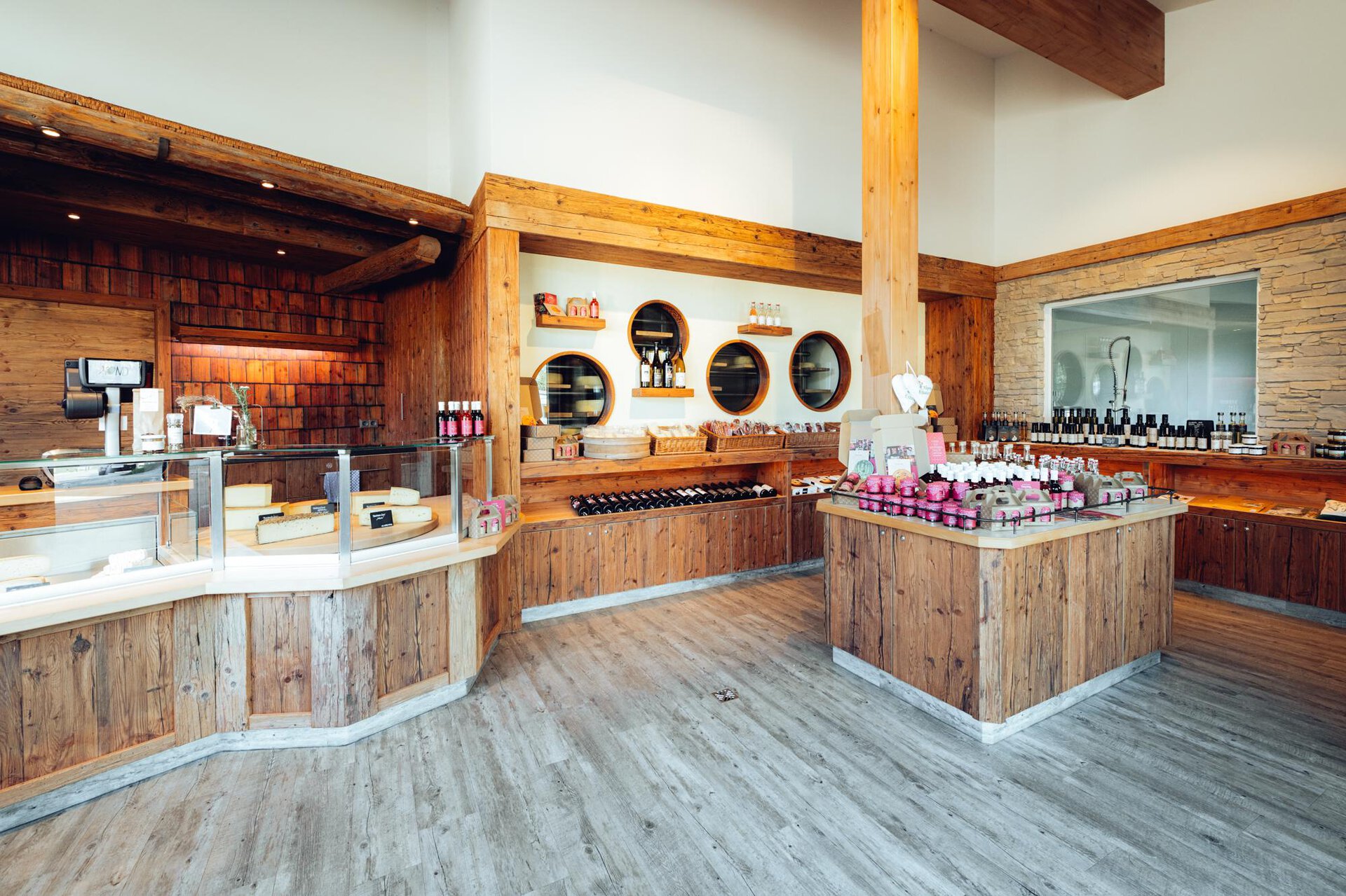 Here, we sell not only our own dairy products, but also meat and sausage products from our cattle, pigs, and goats, as well as our organic eggs. The entire range is complemented by select regional products that can be wonderfully combined with our own. With a direct view of the dairy and the various cheese cellars, it's perfect for browsing the shelves.